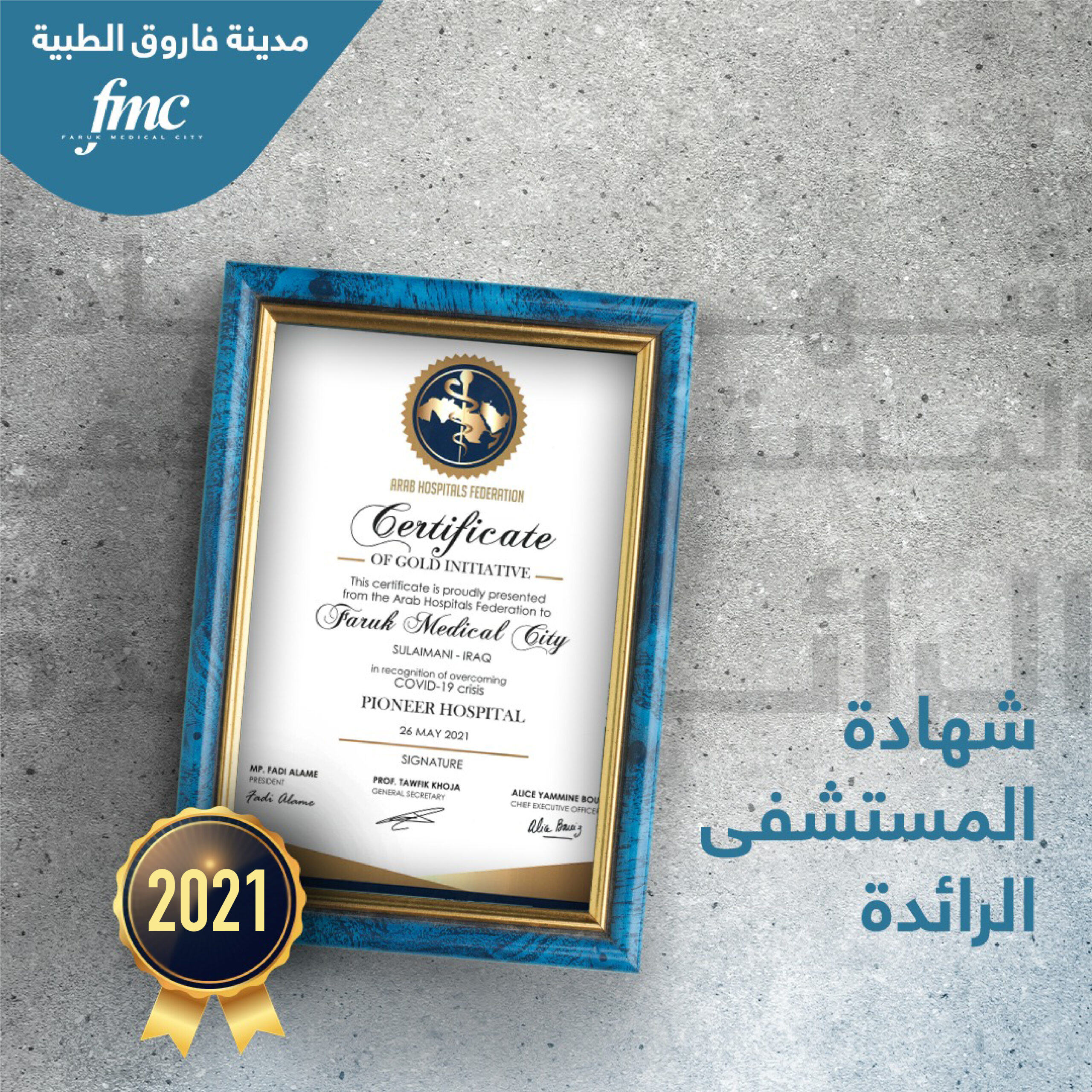 في ٢٦ من مایو ٢٠٢١ و بفخر شدید، حصلت مدینة فاروق الطبیة علی شهادة المبادرة الذهبیة من اتحاد مستشفیات العرب علی کونها مستشفی رائدة تقدیرا للتغلب علی ازمة کوفید ١٩ . نهینیء جمیع الاطباء و الممرضات والموظفین في مستشفی فاروق الطبیة