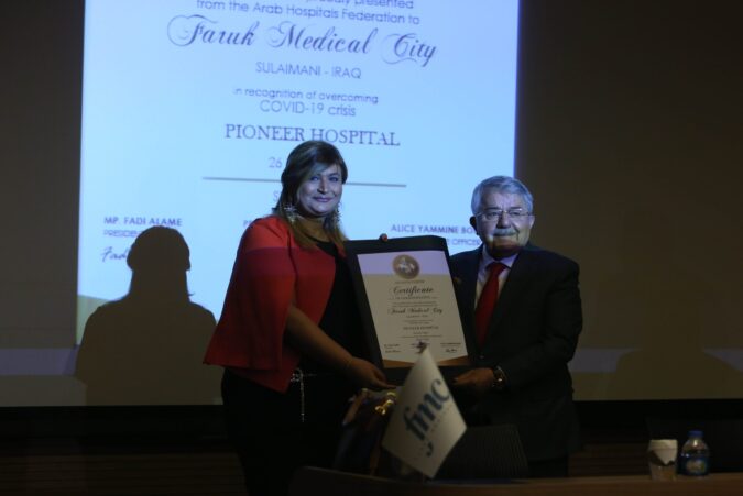 FMC has won the prestigious “Pioneer Hospital” Award granted by the Arab Hospitals Federation (AHF) as part of its Gold Initiative launched by AHF, in recognition of the efforts of healthcare providers in the region during the Coronavirus (COVID-19) pandemic. Ms. Alice Yammine Boueiz, CEO of the Arab Hospitals Association, presented the award to Mr.